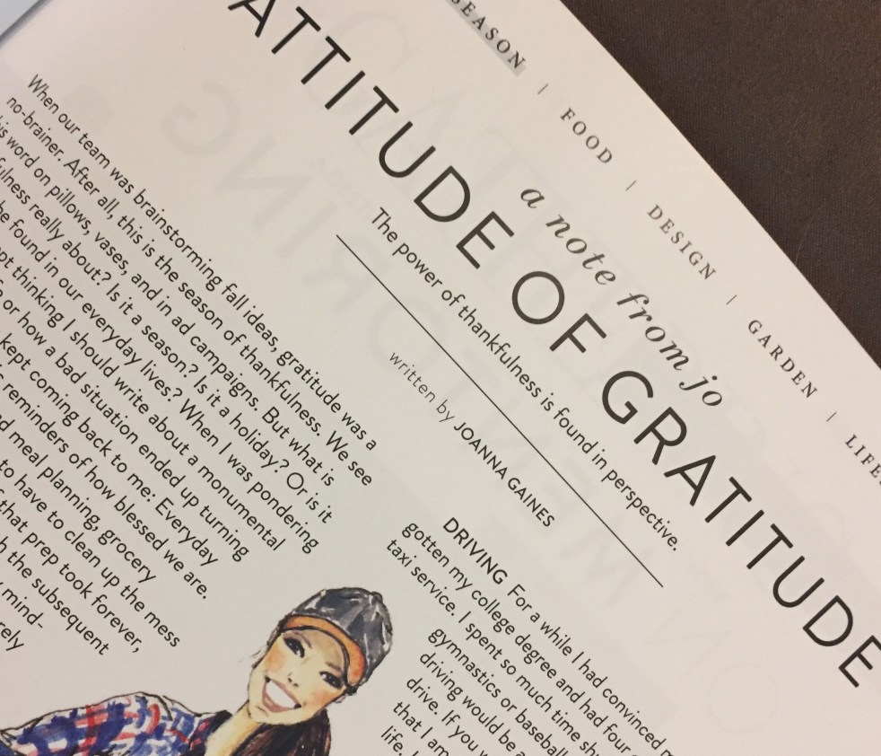 Recently, the word gratitude has popped up a lot; enough for me to take notice. It's been in my Newsfeed (on FB, not the actual news sadly), in my books, and in my new favorite obsession, The Magnolia Journal. In fact, gratitude is the focus of their fall issue, and I just love love love it. JoJo… Continue reading Practicing Gratitude: An Experiment